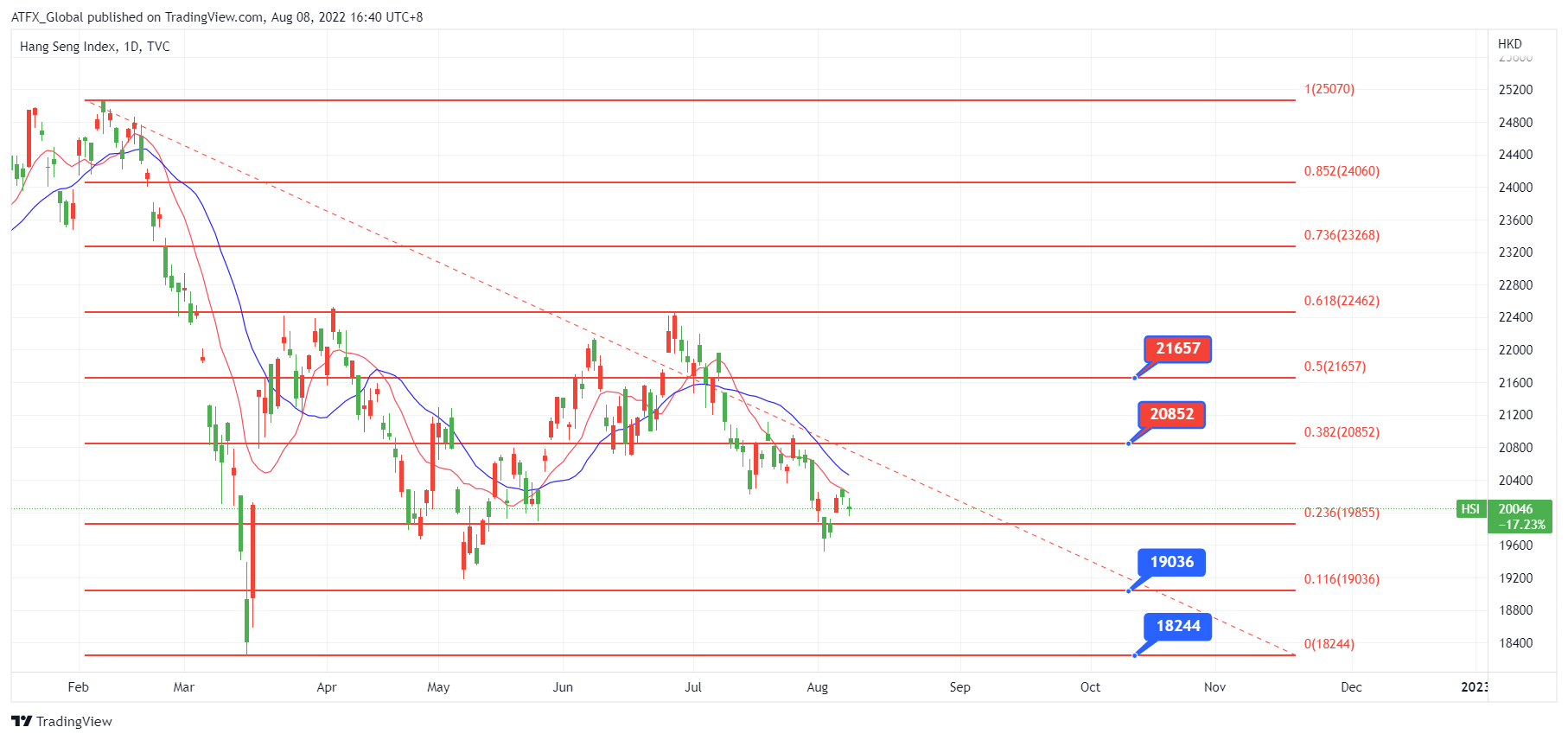 ATFX恒指追踪美国加息压力增, 中国贸易数据好坏参半 ATFX恒指:亚洲股市因对美联储进一步收紧政策的预期升温而回落,加上因投资者消化来自中国的贸易数据,中国股市周一下跌,中国沪深沪深300指数下跌0.2%,港股周一开盘低开,最多下跌逾180点。中国7月份进口增长弱于预期,引发了对当地需求的疑虑。不过上证综合