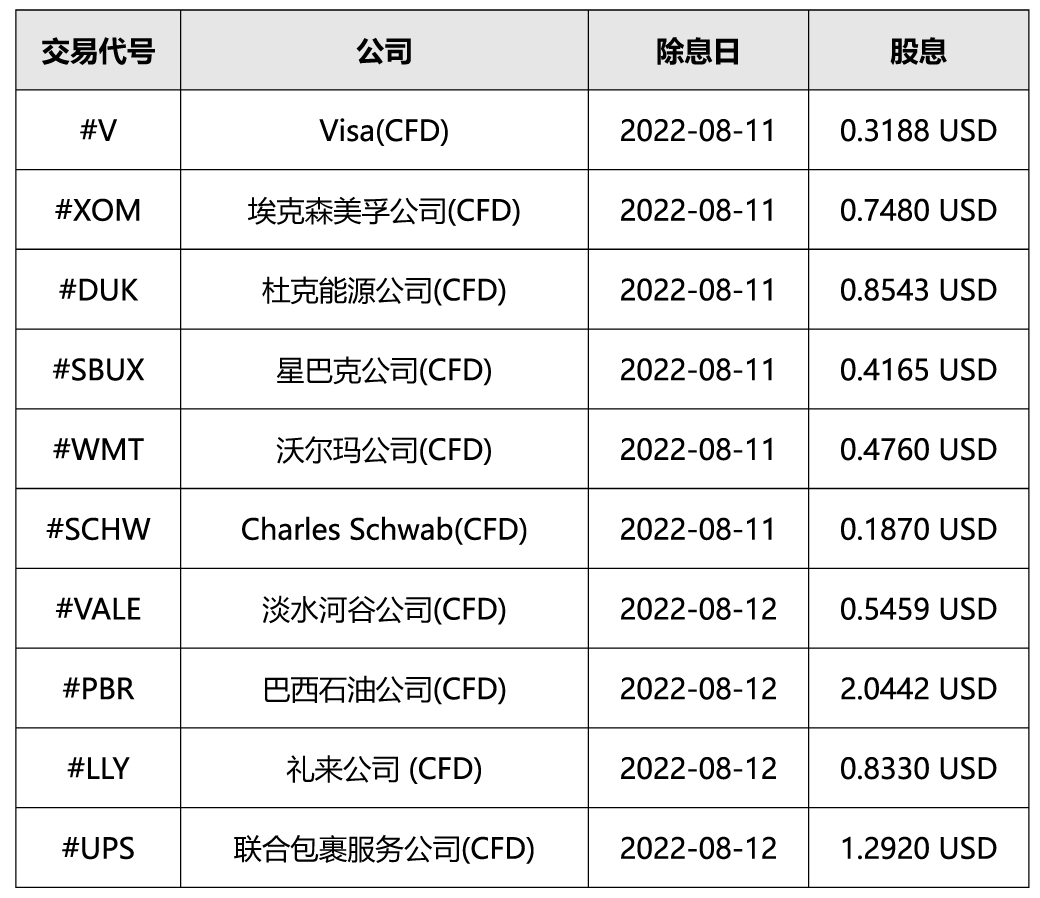 即将到来的股票及TF差价合约企业行动和价格调整 尊敬的客户: 您好! 下表提供的资料,是本公司提供的股票及TF差价合约相关股票的除息日,或其他公司行动即将发生的日期。 请注意,所公布的股息或价格调整金额,仅供我们的流动资产提供者参考。这些数字可能会有所变化。 客户持有该股票或TF差价合