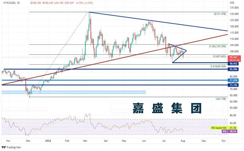 中国国家统计局在周末的时候公布了7月制造业I,结果显示报在49.0,低于50.4的预期值和50.2的前值。这是5个月中第四个月读数低于50的荣枯分水岭,主要原因是各城市为了应对疫情不断实施管控。另外,根据利比亚官方消息,利比亚每日原油产出已升至120万桶。该国上次产出达到这样的水平还是在4月。而欧洲7月标普全球制