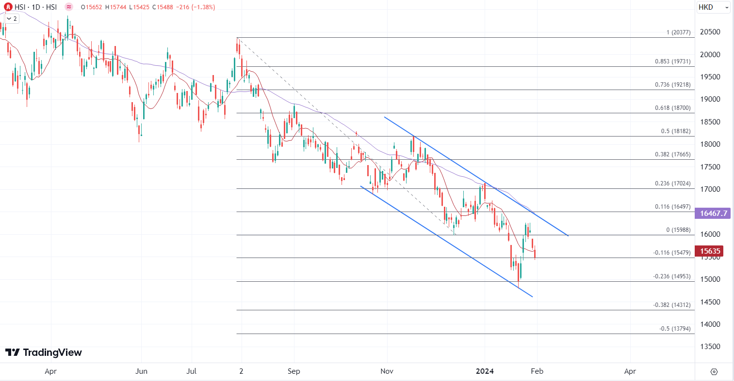 ATFX港股:恒指1月挣扎收官,势将录得11个月来最差 ATFX港股:港股昨日跌373点后,今早先跌后一度走稳,但反弹乏力。内地公布1月份制造业及非制造业I数据后,恒指曾跌102点,报15600,之后止跌回稳。恒指半日跌159点或1%,报15,544点;国指跌55点或1.1%,报5,220点;恒生科技指数跌63点或2.1%,报3,035点。 科技