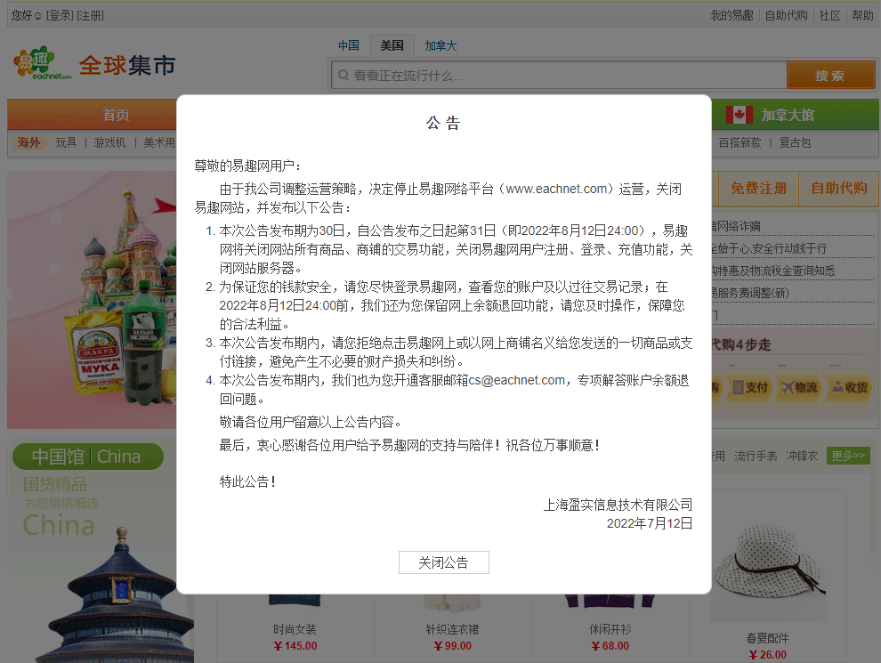 ATFX:易趣网关停,对阿里巴巴来说是好事还是坏事? 7月12日,易趣网公告:由于我公司调整运营策略,决定停止易趣网络平台运营,关闭易趣网站。1999年8月,易趣网创立;2002年3月,美国网购平台ay以3000万美元购买了易趣33%股权,两家企业开始战略合作。 ▲ATFX供图 阿里巴巴成立时间是1999年9月,比易趣网晚一