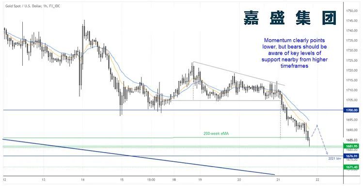 周五(7月22日)亚市盘初,现货黄金窄幅震荡,目前交投于1717美元附近,守住了隔夜大部分涨幅。隔夜金价探底回升,盘中一度跌至1680关口附近,为近16个月新低,但在欧洲央行加息50点之后快速上涨,一度触及1720关口,一方面是美元走弱,使黄金对海外买家的吸引力增加,另一方面是美债收益率下跌,再加上地缘局势担忧升温
