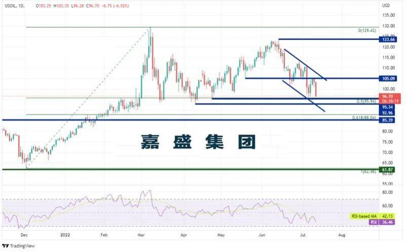 大宗商品市场最新的经济衰退忧虑源自德国ZW报告,其中西得州原油暴跌逾7美元,回到100心理大关下方。德国ZW表面读数报在-53.8,为2011年12月以来最低点,预期值和前值分别为-38.3和-28。7月ZW现况指数报在-45.8,预期值和前值分别为-34.5和-27.6。欧洲央行应该会在7月加息,只是加息“多少”尚未确定。欧洲央行货