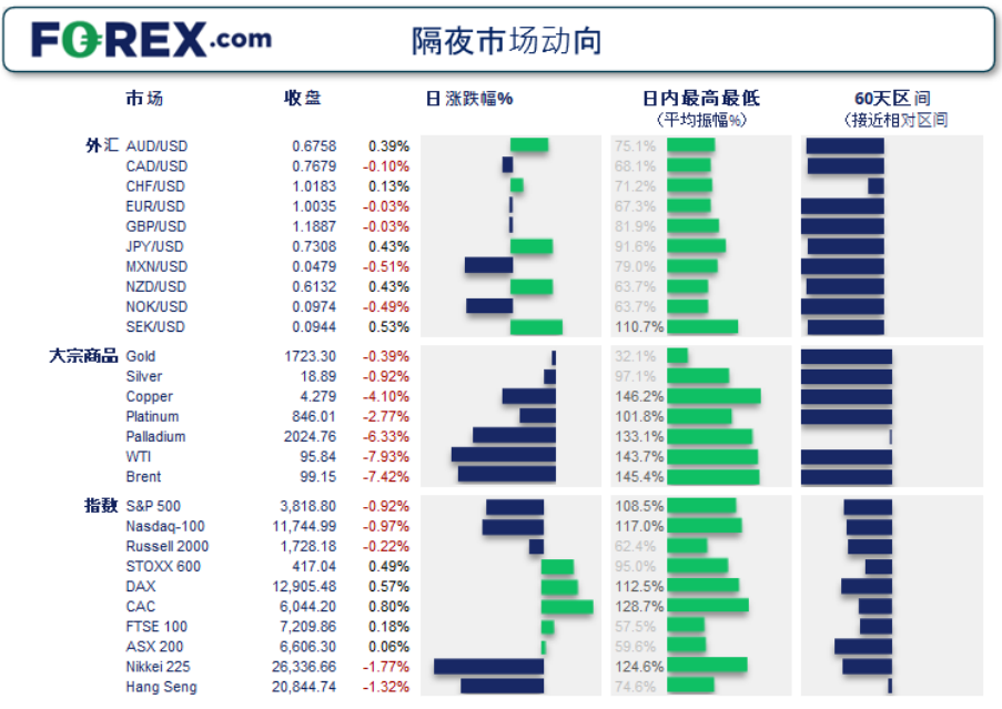 隔夜市场波动/上周的前期波动 美国小型企业衡量指标FI企业信心指数,连续第6个月下降,至9.5年低点。 德国ZW报告跌至疫情爆发以来最低点。 欧元/美元隔夜一度跌破平价,为2002年12月以来首次,但后来自该位稳稳反弹。如果今天发布的美国通胀报告低于预期,可帮助欧元/美元扩大反弹。 今