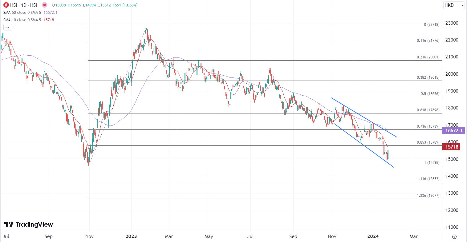 ATFX港股:传一系列救股市措施,恒指连跌后直线拉升 ATFX港股:港股两日挫430点失万五关,创15个月低位后今早出现急涨,据外媒报道,政府考虑推出一系列救股市措施,消息刺激恒指一度急升511点,科指一度急升5.2%。最终恒指半日升368点或2.5%,报15329;国指收报5137,升2.7%;科指飙3.6%,收3143。 报道指,政府考虑