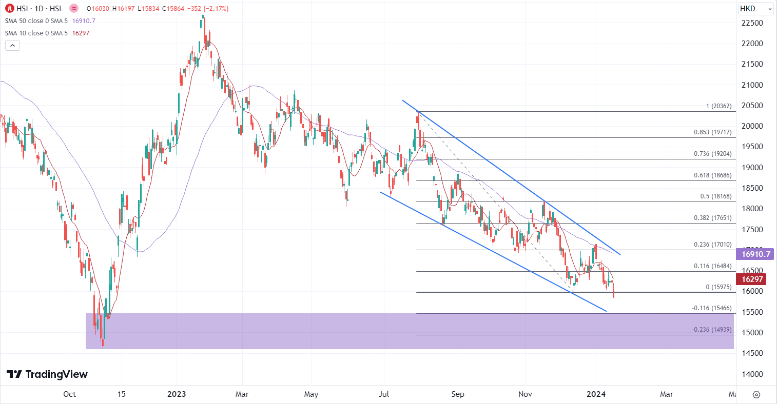 ATFX港股:多个板块齐挫,恒指急跌创逾14个月低位 ATFX港股:港股连跌两日后,今早低开逾1%,恒指低开186点创五周最低位,午后跌穿上午低位一度跌逾350点失守16000关口,再刷新自2022年11月上旬以来的最低位,内地上证指数午后也创逾三年半低。 蓝筹股几乎全面向下,京东健康(06618)沽压最大,股价挫逾7%创上市新