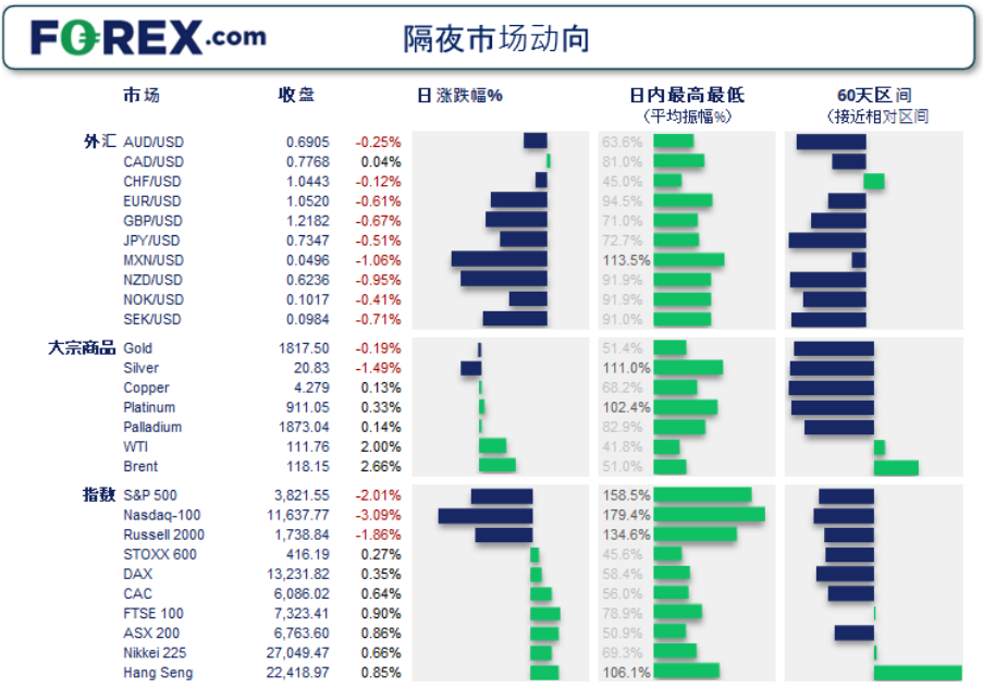 隔夜市场波动/上周的前期波动 隔夜美股下跌。谘商会消费者信心指数追随密歇根大学消费者信心指数,继其跌至历史低点后下降至14个月低点,引人瞩目。 纳斯达克以3.1%的跌幅垫底,标普500指数收出一根看跌吞噬K线,11个板块有10个板块下跌(唯有能源板块上涨)。 美元兑加元以外的所有主要货币悉数