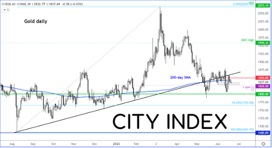 我们已经看到,黄金未能受益于美元过去几天的略显疲态,截至撰写本文时,金价受制于1840美元下方。 过去几周,黄金受各国央行加息、通胀担忧和经济衰退传言影响,一直徘徊于1800-1875美元区间内。显然,一些良莠不齐的影响因子让黄金无法确定走向。收益率上扬及美元全线走强从来都利淡黄金这种无息资产