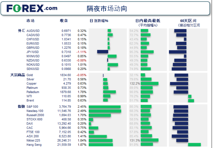 周三(6月22日)亚市盘初,现货黄金微跌,目前交投于1832.69美元。美联储巴尔金早间称在正确的时机,不要被美联储最近的指导“束缚”,要灵活,如果我们在通胀正常化的过程中出现经济衰退,那么它将是温和的。美元指数交投于104附近;美股股指周二跳涨超过2%,上周股市因担忧全球经济陷入衰退而暴跌后,投资者买入成长股