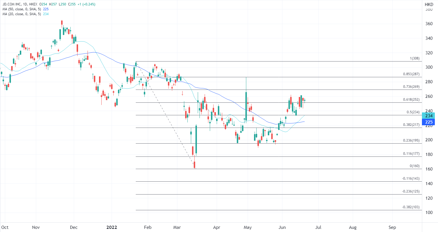 ATFX港股:京东618销售增速放缓,但股价仍有动力可寻 根据京东(9618.HK)公布618购物节战绩,平台累计下单金额达到人民币3,793亿元(约合565亿美元),增幅为10.3%,是自2017年首次披露618活动数据以来的最慢增速。 虽然增速为至少五年来最低水平,但销售依然创下了新高,增速放缓也反映中国消费市场仍处于复苏。对