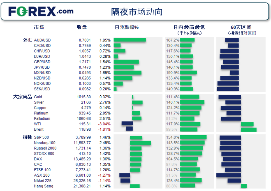 隔夜市场波动/上周的前期波动 美联储加息75个基点,为1994年以来最大单次加息幅度。 美联储上调2022年CI和失业率预测值、下调GD预测值。 美股反弹。美联储主席暗示7月再加息75个基点,透露出更加重视通胀的信号。美联储还预测经济增长放慢,但不会衰退。 主要货币中美元垫底而澳元独占鳌
