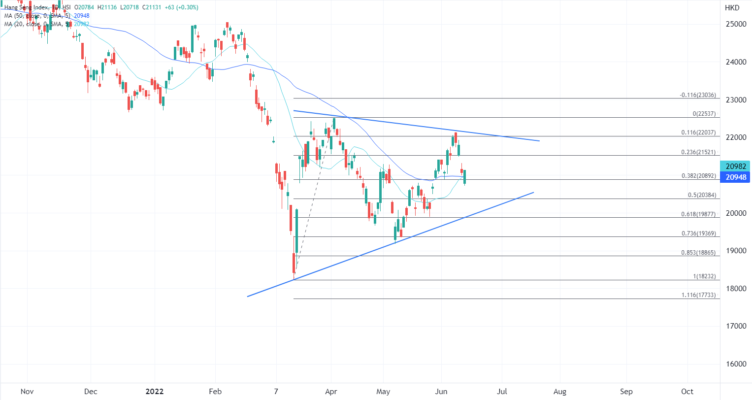 ATFX港股:随外围震荡走低,待美联储决议后待修复行情 ATFX港股:隔夜美股大挫,港股今早承接续低开近300点,失守二万一关口之后跌勢喘定,科技指数一度跌近3%之后短暂回升,险守4500点关口,不过整体大市走势反复。 大型科技股多数向下,阿里巴巴(9988.HK)曾跌4%,午后仍跌近3%,不过美团(3690.HK)逆市上扬,午后