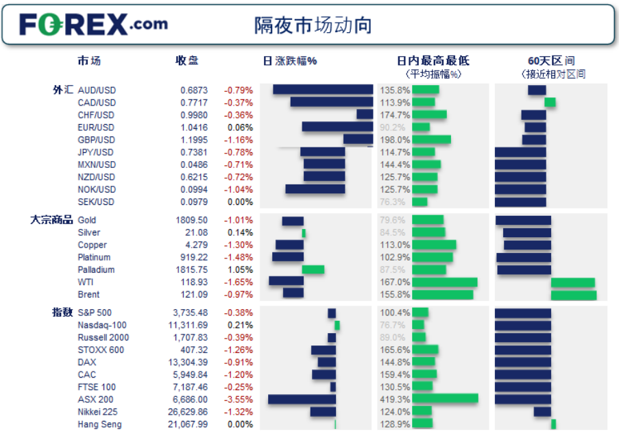 隔夜市场波动/上周的前期波动 亚洲时段以避险基调为本周开局,欧洲和美国时段延续动荡。 投资者现在担心美联储本周加息75个基点。美国10-2年期国债收益率差跌破零,这在历史上预示经济将在12-18个月内衰退。 标普500指数相较高点已跌逾20%,进入技术性衰退。 黄金下跌,避险基调不敌“去风险”策略下对现金