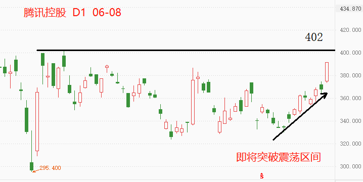 ATFX港股:腾讯控股逼近400关口,即将突破震荡区间 受中概互联网个股集体走强带动,腾讯控股今日涨幅超过6%,最高触及390港元,逼近400整数关口,即将突破3月份至今的底部震荡区间。腾讯控股总市值3.77万亿港元,是港股市场最大规模的公司,它的股价一旦走强,既能够提振整个市场信心,也能够对HI的上涨起到显著支撑作