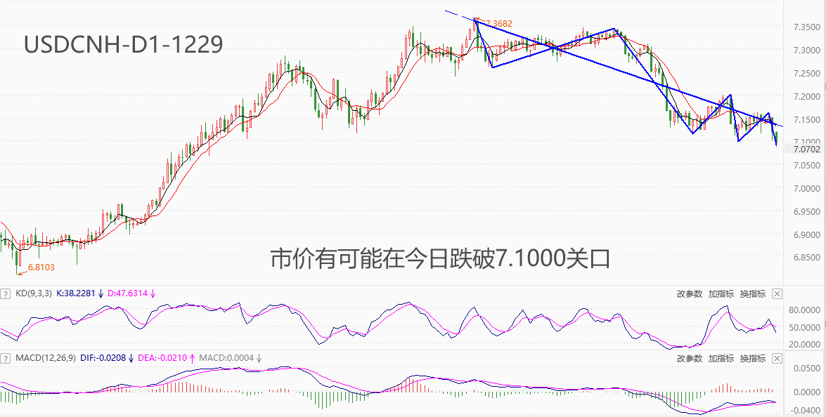 ATFX汇市:离岸人民币再度升值,UDCH创近半年新低 昨日,受美元指数反弹影响,大部分非美货币出现贬值走势,唯有离岸人民币仍保持升值态势。7.1000是UDCH的关键支撑位,12月15日一次向下突破,以失败告终;昨日再次向下突破,虽然阴线幅度较大,但最终收盘在7.1195点,再次失败。截至今日15:50,盘中最低点达到7.0