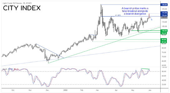 油价11年中首次实现连续6个月反弹,但在5月最后一天的表现让多头有点失望。 油价的反弹势头一直进展良好,昨天还创下高点。得益于美元下跌和美国驾车出游季导致库存锐减,油价打破狭窄的盘整区间。而中国确实放松疫情封控措施以及欧盟在禁运俄罗斯原油,更是增添了油价的上涨动力。昨天近月期货合约上破至12周