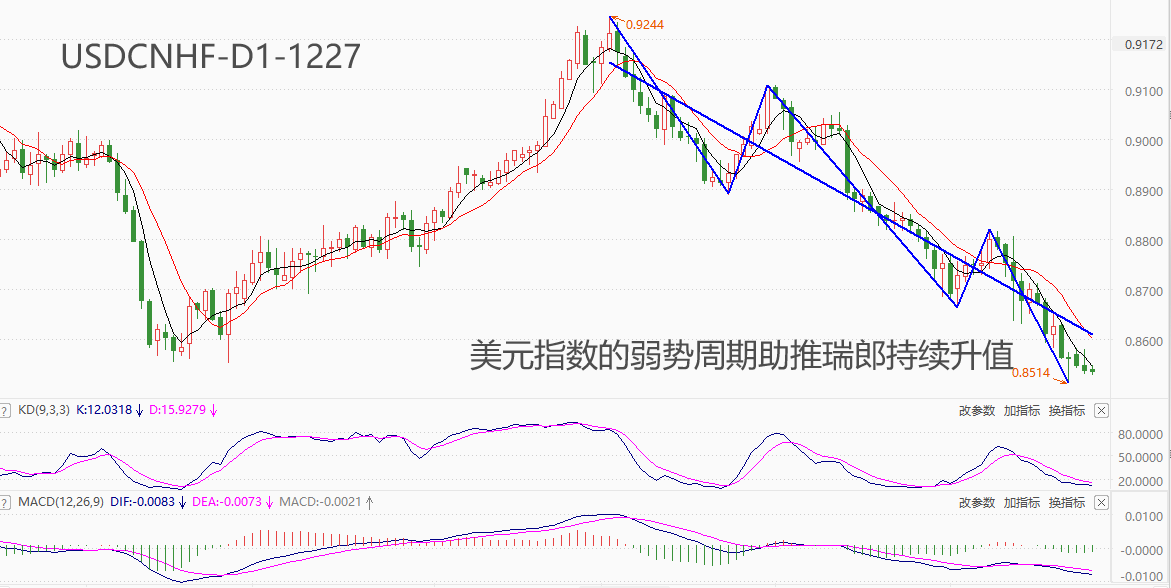 ATFX汇市:经过近三个月连续下跌,美元兑瑞郎创出年内新低 ATFX汇市:由于美元指数进入弱势周期,非美货币纷纷趁机升值,瑞郎也不例外。10月4日至今,UDCHF累计下跌7.38%,最低触及0.8514,刷新年内新低纪录。今年9月份和12月份的利率决议,瑞士央行连续宣布暂停加息,货币政策转向的迹象十分显著。瑞士11月CI年率增
