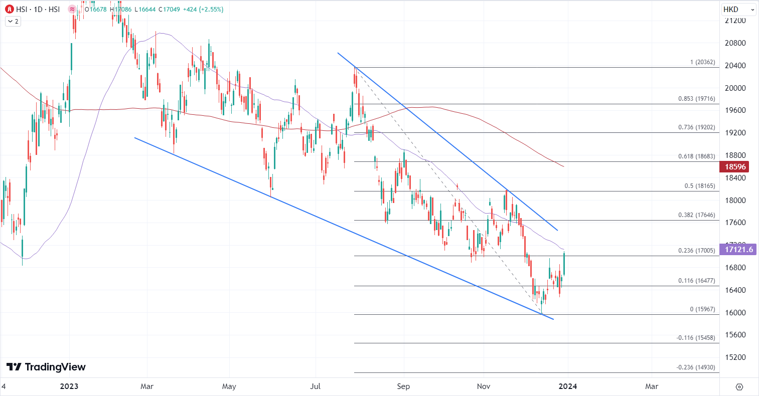 ATFX港股:升逾400点重上17000关口,港股年底前再冲一波 ATFX港股:A股显著造好,带动港股今早高开后升幅扩大,三大指数连续2日反弹,恒指午后升457点重上万七关。蓝筹股普遍造好,中升控股(00881)升逾7%,暂为最大升幅蓝筹。 大型科技股表现强势,科技指数午后升幅扩大至4%,网易(09999)昨日反弹一成二后,今日继