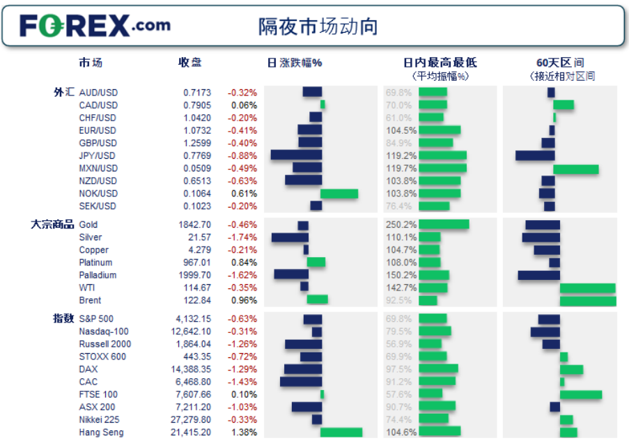隔夜市场波动/上周的前期波动 美股的反弹势头在昨天中断,背后原因是美联储官员发表了强硬评论,且油价震荡起伏。 油价跌2.5%左右。有报道称,OC+部分成员国正在考虑豁免俄罗斯的OC+产出配额义务。 欧元区通胀年率达到8.1%,超过预期,创下记录,增加欧洲央行升息概率。然而,欧洲央行官员在