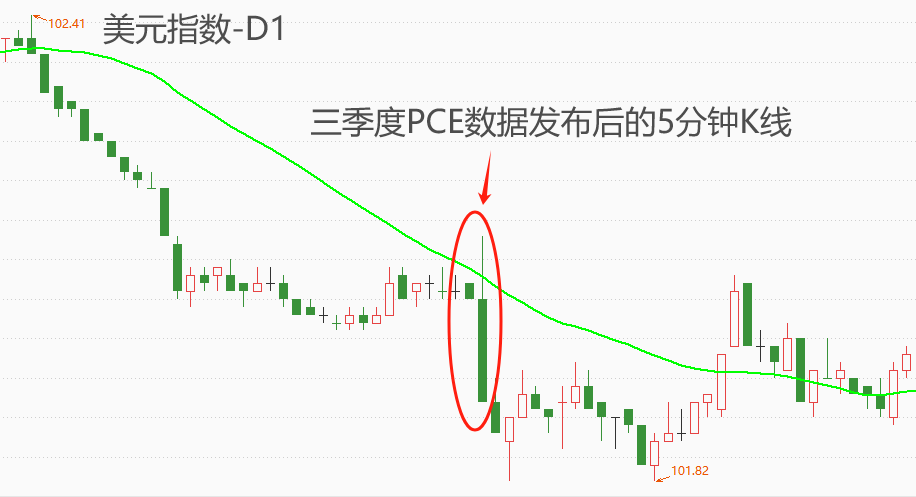 ATFX汇市:隔夜美元指数大跌,URUD站上1.1000关口 ATFX汇市:昨日,美元指数大跌0.66%,最低触及101.73点,月内第三次跌破102关口。昨日的数据面来看,美国经济分析局发布第三季度核心C物价指数年化季率终值2%,低于前值2.3%,低于预期值2.3%,高通胀问题进一步消退。从时间点上看,该数据发布后,美元指数分钟级别
