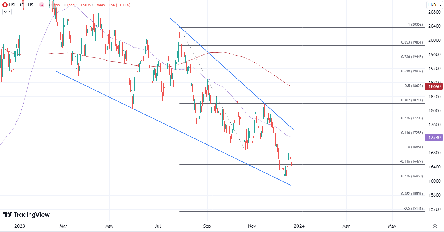 ATFX港股:恒指保持沽压模式,关注假期前的低位吸纳 ATFX港股:恒指昨日跌162点后,今早挫逾两百点后跌幅削减,恒指半日跌101点或0.6%,报16527;国指收报5602,跌31点或0.57%;科指跌0.5%,收3712,大市半日成交419.55亿港元。 科网股涨跌不一,美团(03690)低开1.8%后沽压骤增至跌6%,创逾三年半低。快手(01024)启动2