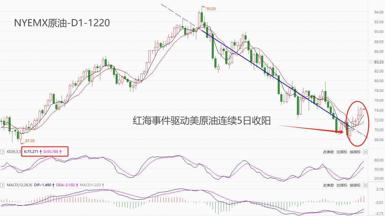 ATFX期市:受红海事件影响,美原油连涨五日,75美元关口待突破 ATFX期市:本周一,也门胡塞集团发表声明称:禁止红海上的商船前往以色列港口。美国相关部门表态称,将采取多国行动保护红海贸易。该事件是巴以问题的衍生事件,由于红海地处国际航运要道,且距离中东产油国较近,所以引发市场人士对于原油供应端的担忧。1