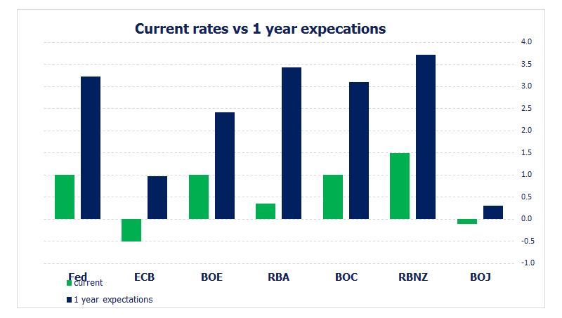 交易者须得留意利率预期相对当前利率水平的变化。 随着通胀持续上升成为全球性现象,各国央行努力应对,或结束各自的资产购买计划,或纷纷加息。除了欧洲央行和日本央行以外,大部分主要央行业已退出量化宽松计划,而且欧洲央行可能也很快退出。如此一来,抗击通胀的主要工具只剩加息。 下图是部分主要央行当前利