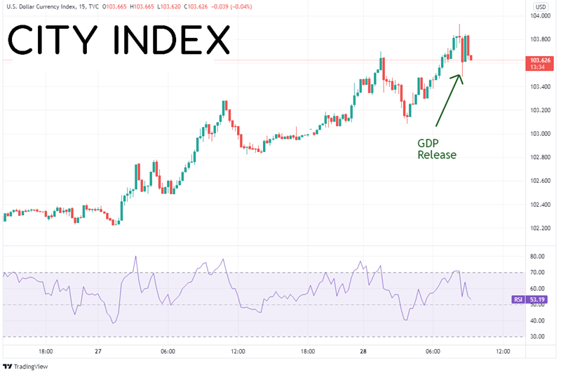 表面GD季率下降1.4%,低于增长1.1%的预期值和增长6.9%的前值。 虽为回顾式数据,美国一季度GD初值还是引起了市场的注意。表面季率下降1.4%,低于增长1.1%的预期值和增长6.9%的前值。GD报告中的通胀分项指标,即GD平减指标初值季率上涨8%,预期7.3%,前值7.1%。表面数字不及预期的大部分原因是美国贸