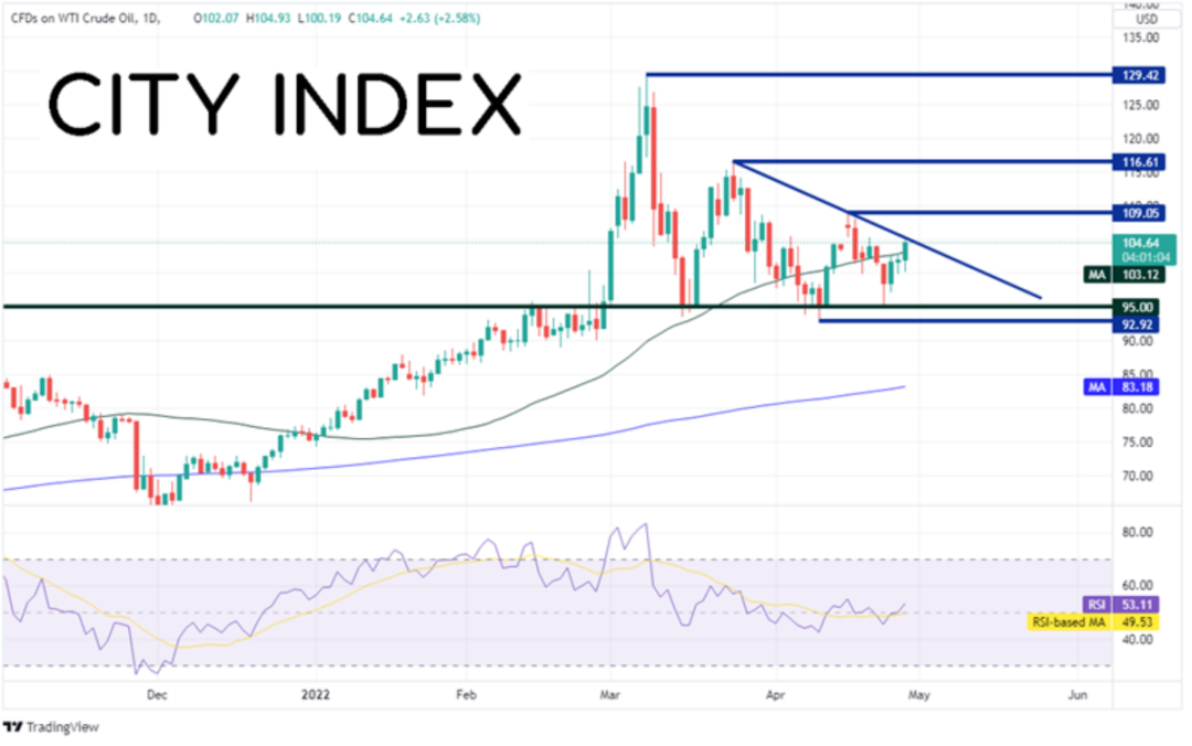 欧盟准备禁运俄罗斯原油,油价因此大涨。 欧盟终于准备不再进口俄罗斯原油了吗?欧盟此前和其它部分国家一起一直不支持禁运,但周四有媒体报道,德国现在准备不再自俄罗斯购买原油。欧盟接下来必须找到新的能源进口来源,这点帮助西得州原油和布伦特原油今天涨逾2.5%。 3月1日之前西得州油