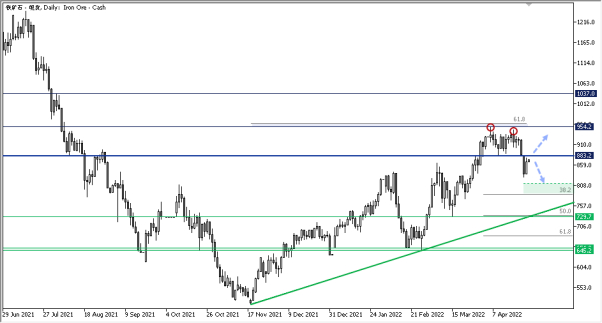 铁矿石价格周一下破关键支撑位,铁矿石图表透露什么信息? 中国封锁管控措施引发需求担忧,于周一重创大宗商品,也带来全球成长放慢的前景,打击全球股市。 铁矿石也未能免于动荡,价格追随中国不锈钢期货下跌,当天跌幅高达11%。但中国政府周二誓言为经济提供支持,帮助铁矿石价格在周二收复周一大部分