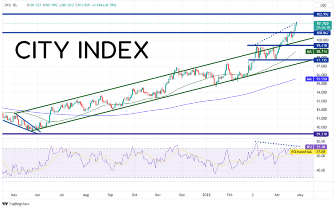 美元指数站上上升通道的上轨趋势线,正剑指2020年3月高点。 2021年5月,当美联储暗示可能准备开始量化紧缩,美元指数也随之启动涨势。去年一整年,伴随着通胀的飚升,美元指数亦如是。美元指数从5月25日开始自89.53低点有序上涨,形成上升通道,直至打破通道上轨,今天创下高点102.07。美元指数4月5日以