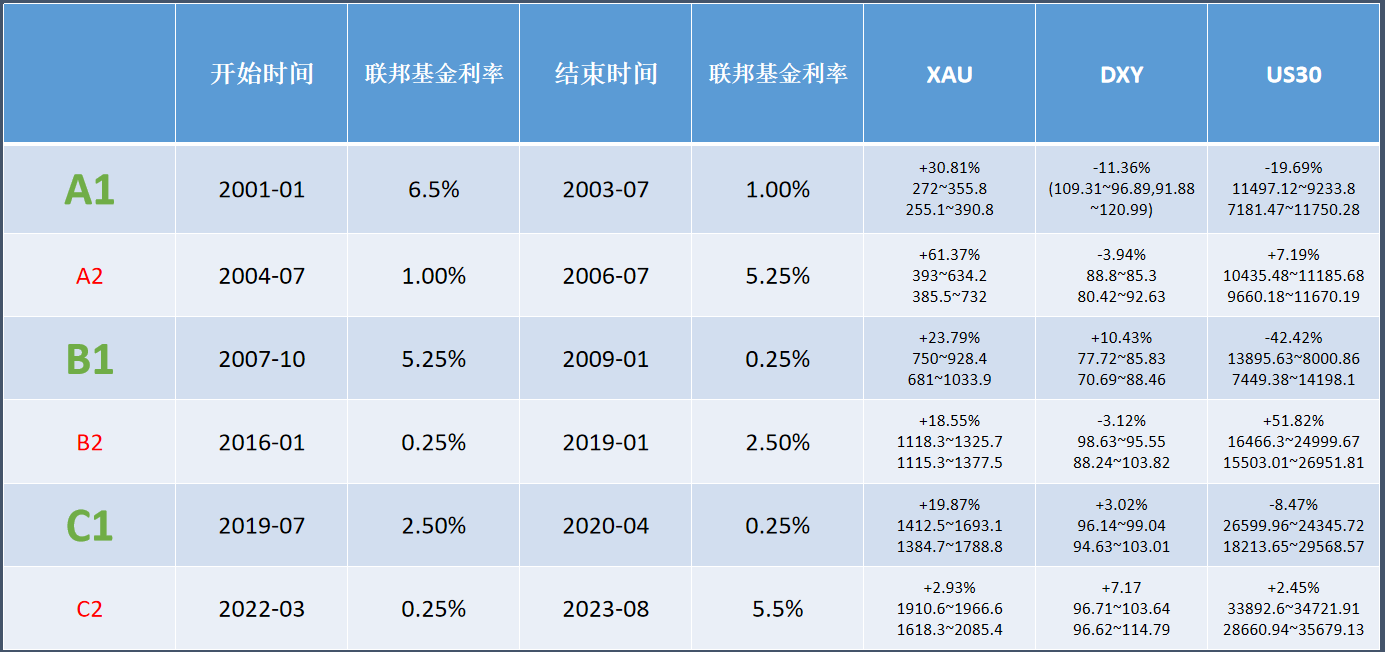 ATFX科普:2000年至今的三次降息潮,对黄金、美指、美股的影响分析 ATFX科普:2000年至今,美联储分别进行了三次降息周期,对应的开始与结束时间段分别为: 第一轮降息潮:开始时间2001-01,联邦基金利率6.5%;结束时间2003-07,联邦基金利率1%,总计降息550基点。这段时间里,美元指数下跌11.36%,最低触及91.88,符