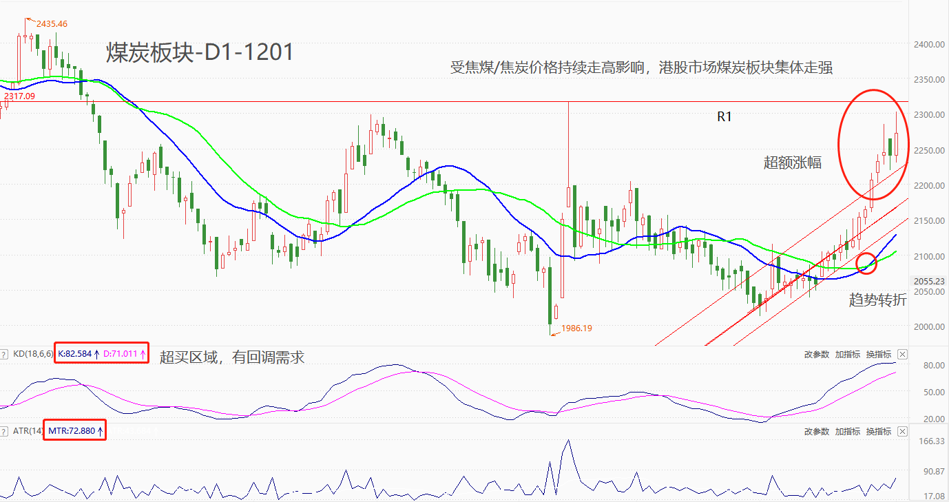 ATFX港股:受煤价持续大涨提振,煤炭板块指数价格逼近半年高点 ATFX港股:11月2日至今,港股市场煤炭板块指数累计上涨11.99%,今日最高价已经逼近5月25日以来最高点,如果涨势延续,市价将很快刷新半年多来的纪录高位。驱动煤炭板块集体走强的主要因素是,焦煤价格持续上涨,6月1日至今,焦煤价格累计涨幅70.67%,最高