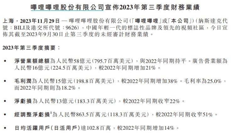 ATFX港股:净亏损收窄但超预期,游戏业务拖哔哩哔哩后腿 ATFX港股:上周哔哩哔哩(09626)公布第三季度业绩后股价跟随大跌,港股创下自2022年11月以来的盘中最低水平。财报发布后,站美股盘前一度跌超6%。 财报显示,哔哩哔哩第三季度净亏损人民币13.5亿元,上年同期净亏损为人民币17.1亿元。第三季度净营业额总额