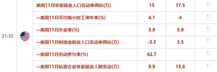 ATFX:12月05日,国际市场,一周大事件前瞻 ATFX:本周的数据、事件重要性由高到低分别为:美国11月非农就业报告、澳洲联储12月利率决议、加拿大12月利率决议。我们来逐一分析解读: ▲ATFX图 本周五21:30,美国劳工部劳动统计局将公布美国11月非农就业报告,其中两项数据需重点关注。其一,11月季调后非农就业