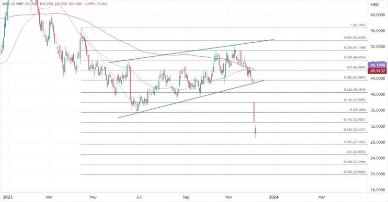 ATFX港股:业绩下调遭遇大跌停牌,药明生物股价仍有下探空间 ATFX港股:周一港股异动股中,药明生物(02269)早段经历大跌后中途停牌。停牌前报33.15元,跌近24%。同系的药明合联、药明巨诺及药明康德较早时跌逾4%至6%,恐慌情绪也蔓延至整个CXO板块带来重创。 触发大跌的原因在于:药明生物披露部分业务收入低过预
