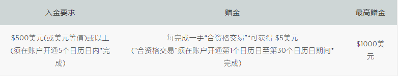 在嘉盛集团开设账户后5个日历日内*成功入金$500美元或以上,即可在账户开通30个日历日内从每手“合资格交易”获得$5美元赠金*。 参与活动,您必须开立真实账户,并在账户开通后5天内*完成500美元或以上的注资,并根据要求完成活动报名。此次优惠活动是由FORX嘉盛集团提供。FORX嘉盛集团是嘉盛全球市场有限公司(