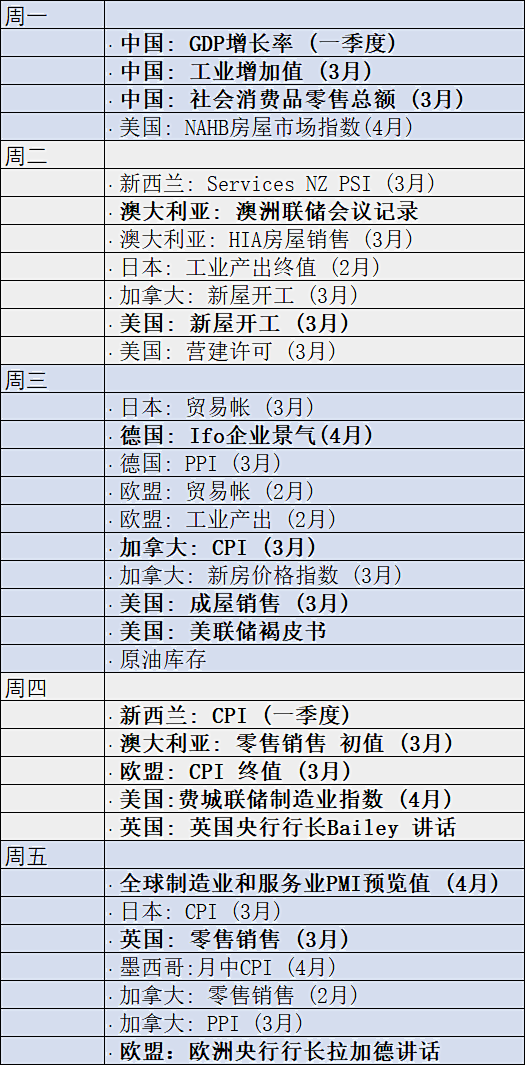 4月18日-4月22日当周,投资者需要关注的数据:中国第一季度GD,美国3月新屋开工,4月15日当周AI和IA原油库存变动,美国截至4月16日当周初请失业金人数。大事方面需关注澳洲联储货币政策会议纪要,美联储公布经济状况褐皮书。此外,下周多位美联储官员和英国央行行长贝利将发表讲话,投资者需保持关注。最后,投资者还