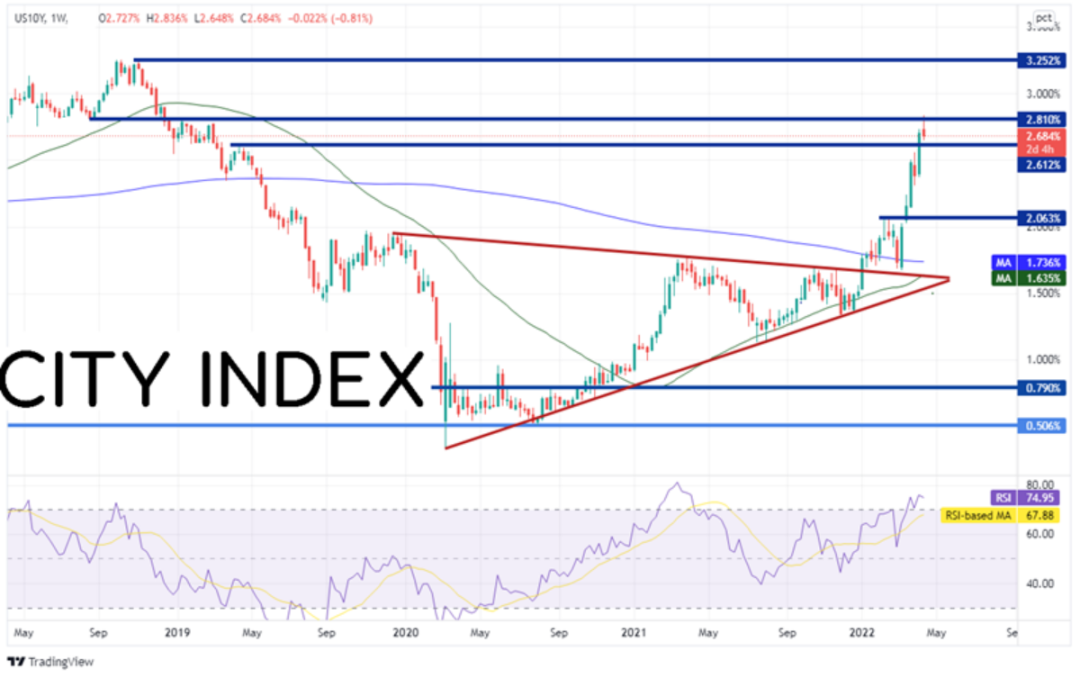 昨天收益率开始下跌,今天美元接力调头向下。 众所周知美国债券收益率最近大涨,但10年期收益率已遭遇阻力。周图上的阻力落在2018年12月以来的水平阻力位2.81%,而RI也进入超买区域。在一度涨至2.836%高点后,收益率业已回撤。 来源:Tradigviw,toX 美元以及部分美元货币对和昨天开