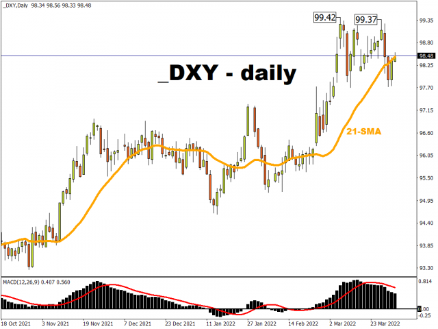 周四(4月7日)美元指数升至近两年高位,受大宗商品价格回落影响,澳元和纽元兑美元跌幅居前。COX6月黄金期货录得三个交易日来的首次上涨,并创一周来的最高收盘价;分析师称,当前金价格受到了地缘局势和美联储日益强硬的货币政策立场两种力量角力的影响。油价从三周低位大幅回升,美油尾盘涨近1%,收报97.13美元/桶,