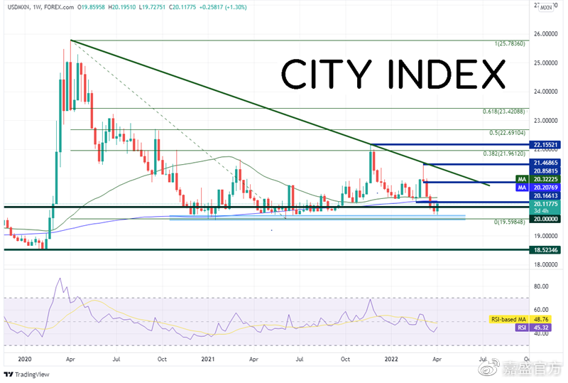 美元/墨西哥比索陷于一个长期支撑区域和长期下降三角形的下降趋势线构成的区间内。 墨西哥CI在早些时候公布,结果显示3月年率上涨7.45%,高于7.36%的预期值和7.28%的前值,创下2001年1月以来最高点;核心CI年率6.78%,高于6.7%的预期值和6.59%的前值,为2001年6月以来最高点。还记得墨西哥央行在3月25
