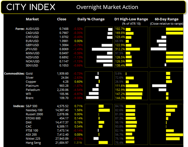 大宗商品隔夜普遍下跌,拖累纽元和澳元走弱。有消息称,乌克兰和俄罗斯将举行和谈。市场予以高度关注。 美国现货市场周一收盘情况: ·道指涨233.09点,涨幅0.27%,收于34,955.89 ·标普500涨32.46点,涨幅2.51%,收于34,058.75 ·纳斯达克100指数涨233.094点,涨幅1.58%,收于14,987