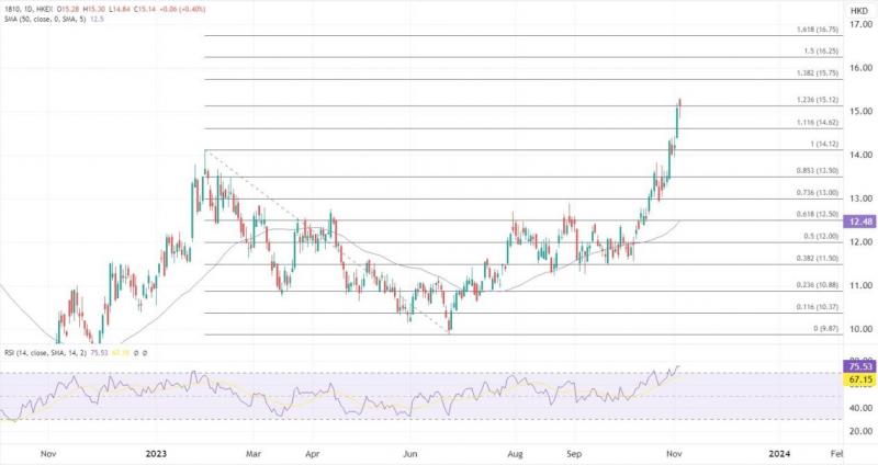 ATFX港股:小米14首销破纪录,小米股价连升四周 ATFX港股:周四小米股价一度升7%,触及15.2元,创2022年3月底以来新高,股价有望连续四周上涨。前日已正式首销的小米14系列,开售5分钟的销量是上代小米13系列销量的6倍。小米14系列销售理想,带动小米股价造好。 小米(01810.HK)公布,旗下小米14系列手机于10月31日