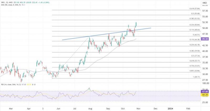 ATFX港股:首季盈利按年增1.2倍,新东方股价破顶 ATFX港股:受业绩强劲的提振,新东方股价周四高开近5%后扩大升幅破顶,一度大涨9%。业绩亮眼主要受益于供给出清和需求复苏,新东方在素质教育、直播电商领域表现亮眼,布局文旅等业务。 新东方教育(09901)公布,截至8月底的本财年第一季非通用会计准则经营利润按年