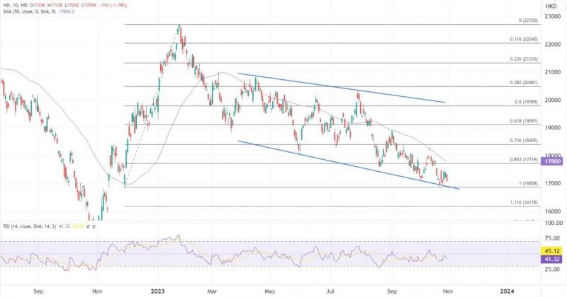 ATFX港股:多股绩后走软,恒指回吐逼近万七关口 ATFX港股:10月最后交易日,今日恒指低开68点报17337,跌幅随即扩大,半日急跌超过300点下试17000关口。内地制造业活动再陷收缩,国家统计局公布,10月份,中国制造业采购经理指数(I)降至49.5,逊于市场预期。 午后初段,科技指数维持走低,下跌2.5%,权重科技股下