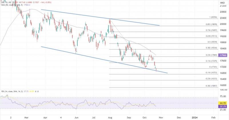 ATFX港股:恒指在万七关口挣扎,一度创去年11月以来新低 ATFX港股:昨日港股重阳节假期休市,期间外围及内地股市表现向下。恒指连跌三日累挫601点创今年收市新低后,今早再挫近300点,失守一万七千点关口,创2022年11月底以来新低。 午盘港股三大指数探底回升,恒生科技指数盘中一度转涨至0.3%,午间收跌0.48%,恒