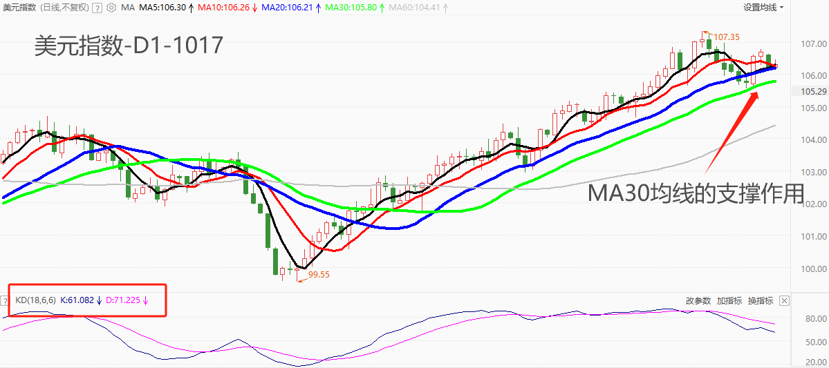 ATFX汇市:美元指数不跌破A30均线,则未来涨势仍能延续 ATFX汇市:A30均线,被技术分析派看作是趋势转折的标准线:如果连续三根K线的收盘价位于A30均线的另一侧,意味着趋势反转即将来临;如果市价触及A30均线后大幅正向波动,意味着趋势仍能延续一段时间。上周三,美元指数下跌至最低105.56点,当时的A30读数为10