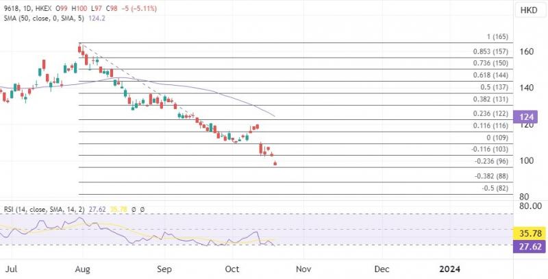 ATFX港股:京东股价再创新低,留意过度修正后技术反弹 ATFX港股:今日港股全面承压,科技股延续跌势,京东(09618.HK)早段跌4%再创新低,对应的是近期多级机构下调京东目标价及评级,包括京东健康和京东物流在内的京东系股价也跟随集体走低。 京东业务增速不及预期,以及市场对于当前国内经济环境和市场消费复苏的