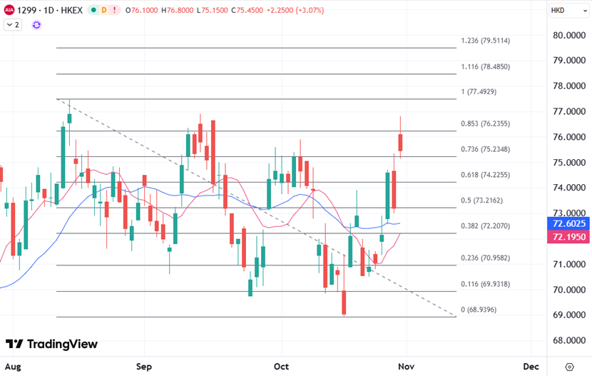 ATFX港股:新业务价值再创亮点,友邦保险股价逼近前期高位 ATFX港股:友邦保险(01299)公布最新业绩,新业务价值创第三季新高,新业务价值利润率增加5.7个百分点至58.2%,今早股价跟随利好高开近4%后涨幅扩大。 友邦保险(01299)公布,于截至9月底止首3季,新业务价值43.14亿元(美元.下同),按固定汇率计算,按年上升