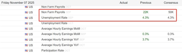 ATFX汇市前瞻:美国10月大非农或推迟发布,英央行与澳洲联储本周决议 ATFX汇市前瞻:本周即将发布的经济数据重要性由高到低分别为:美国10月非农就业报告、英国央行利率决议、澳洲联储利率决议,接下来做逐一解读。 ▲ATFX图 本周五21:30,如果美国政府结束停摆,美国劳工部劳动统计局将公布10月非农就业报告